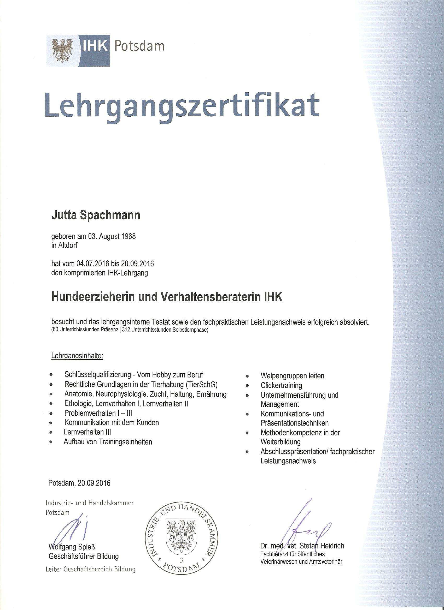 Im Jahre 2017 wurde die "Hundeschule Jutta Spachmann" 10 Jahre alt. Meine Ausbildung nach §11 Tierschutzgesetz, zur Hundeerzieherin und Verhaltensberaterin habe ich im September 2016 bei der IHK Potsdam erfolgreich abgeschlossen.